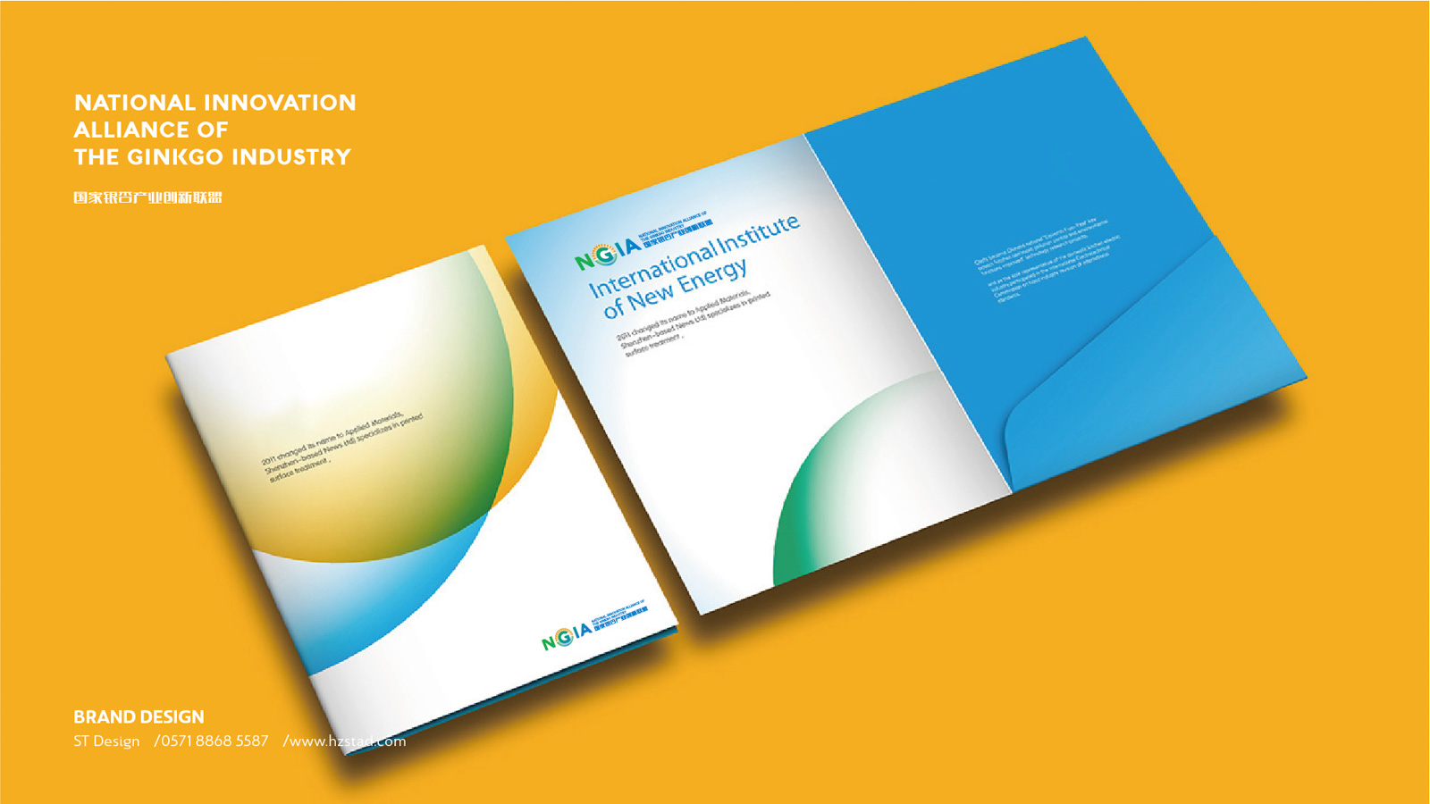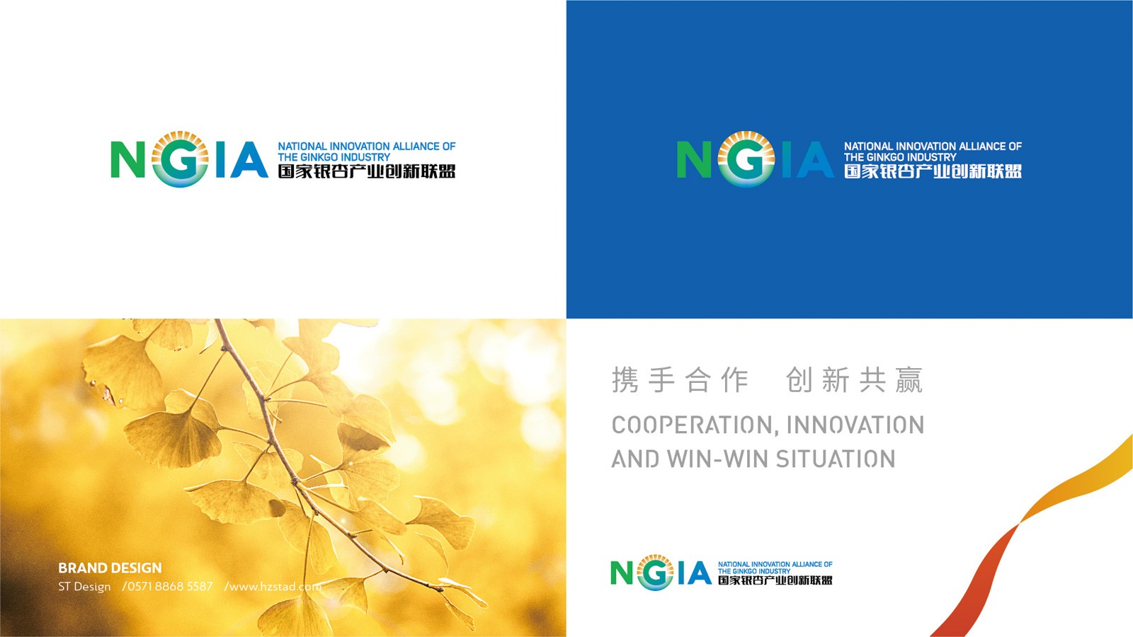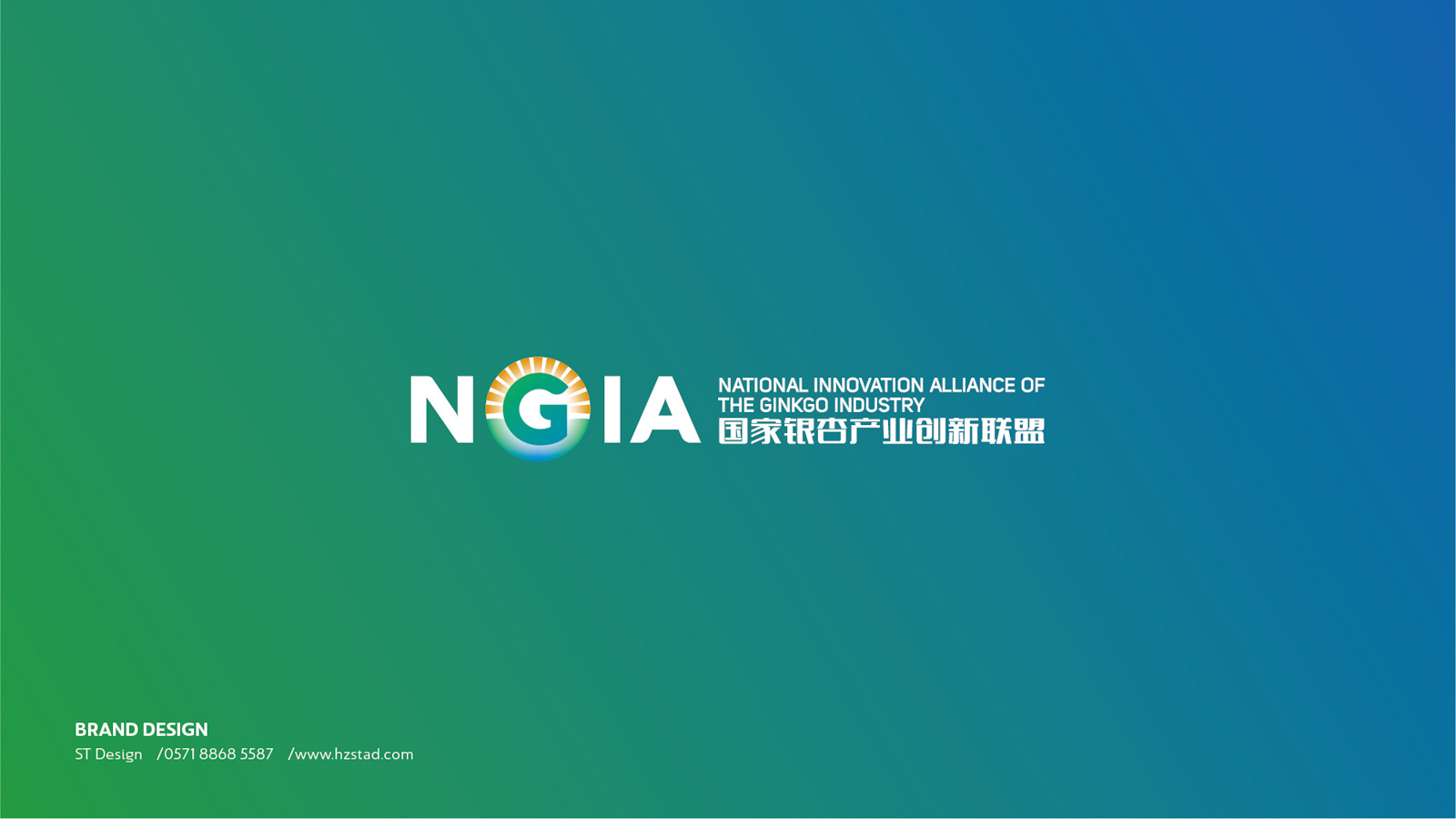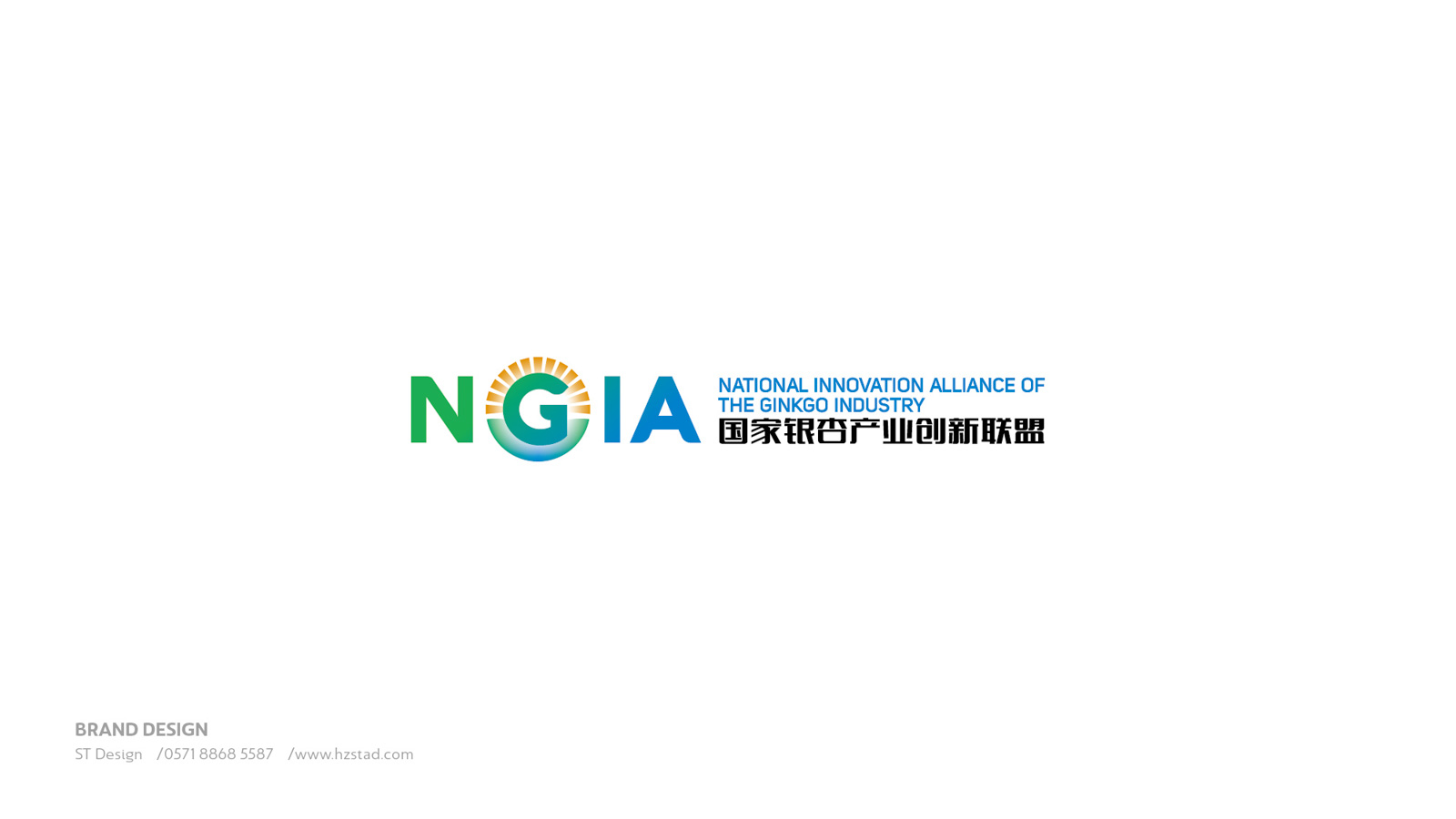 石特根據(jù)新成立的銀杏創(chuàng)新聯(lián)盟需求,未來發(fā)展的規(guī)模以及企業(yè)定位為其設(shè)計產(chǎn)業(yè)LOGO。在LOGO的設(shè)計上,以銀杏聯(lián)盟的英文縮寫“NGIA”為設(shè)計主體,表明主旨。利用大寫字母“G”的外形特點,與圖案相結(jié)合,圖案如早晨初生的太陽從高山上緩緩升起,點明銀杏創(chuàng)新聯(lián)盟如同太陽一般熾熱,蘊含能量,從最低處慢慢走向最高處,隱喻銀杏創(chuàng)新聯(lián)盟作為后起之秀的蓬勃生機(jī)。在顏色的選擇上,采用以藍(lán)色、綠色為主,橙色為輔,藍(lán)色代表天空、干凈,綠色代表森林、天然,橙色代表陽光、希望,深刻的表達(dá)出銀杏創(chuàng)新聯(lián)盟的初衷。