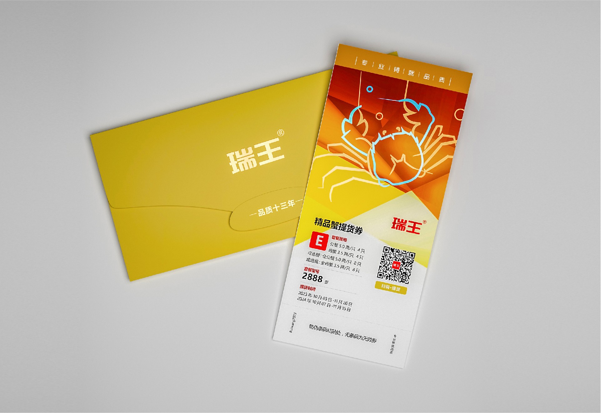 采用信封式包裝,以黃色為主色調(diào),代表大閘蟹的鮮美。在信封的正面上部印有瑞王大閘蟹的LOGO,以突出品牌形象,并附上“品質(zhì)十三年”的口號,展示企業(yè)的信譽度。