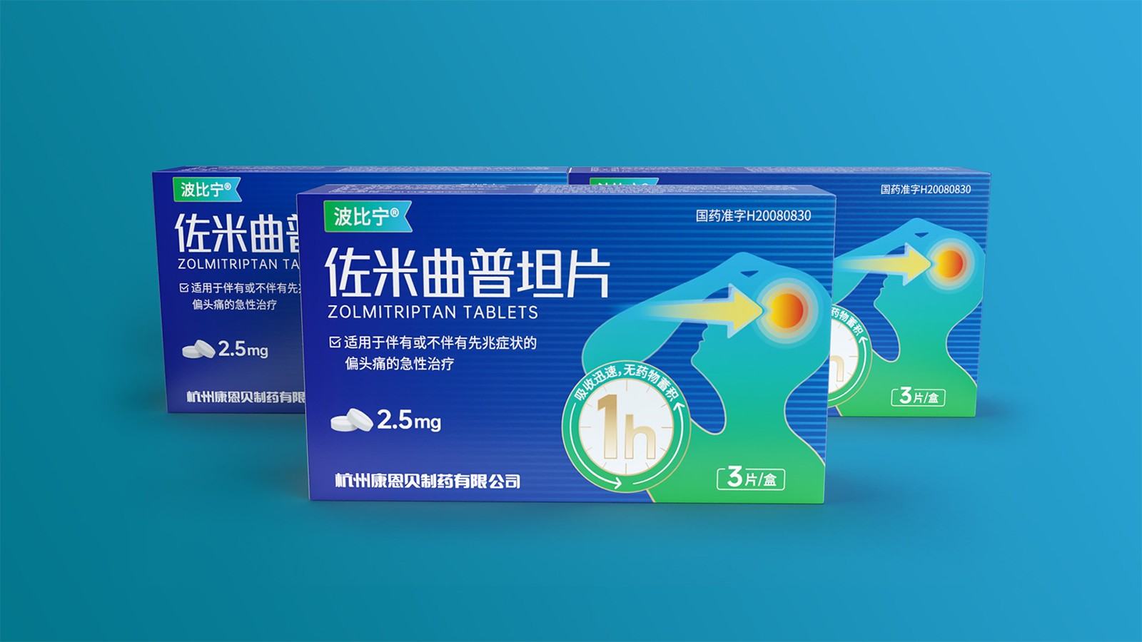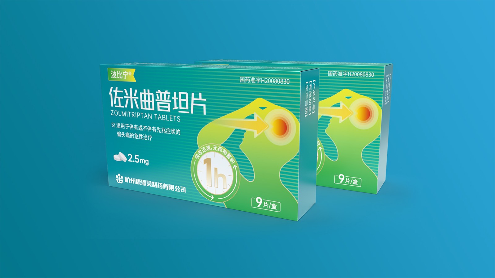 石特綜合考慮產品的使用場景、產品功效、消費者心理等因素并結合創意對藥品的包裝設計提出方案。對于佐米曲普坦片的包裝,以藍色為主色,藍色寓意健康,添加人體頭部剪影并展示頭痛癥狀,可以凸顯藥品的功效,被放大的1h也可以告訴人們該藥品的見效快速。